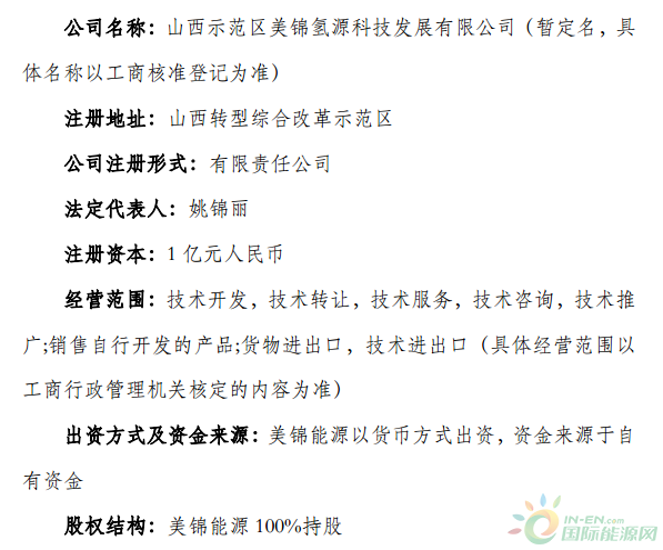 美锦氢源将作为公司在山西综改区的项目主体之一,负责氢气制取、加氢站、储运设备、燃料电池、燃料电池汽车、分布式能源等