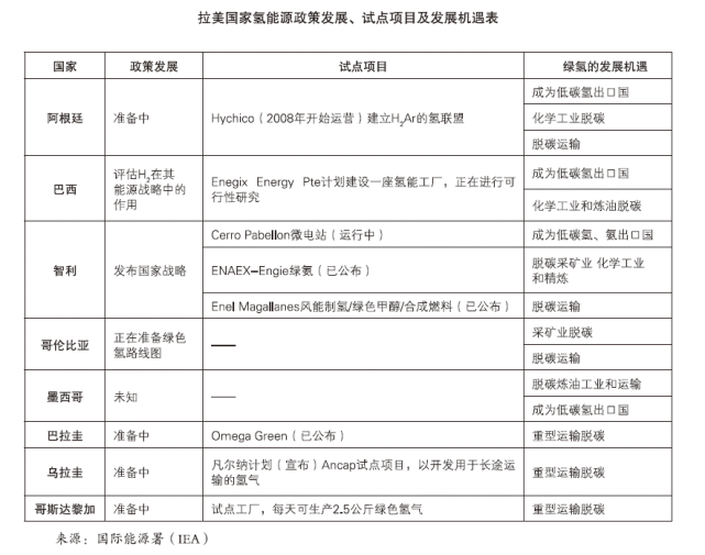 在氢能领域,拉美各国的发展情况和未来规划处于不同阶段。阿根廷、巴西、智利和哥伦比亚均发布了氢工业战略,希望在未来几年成为低碳氢出口国。墨西哥、巴拉圭和乌拉圭寻求使用氢能来使工业和交通脱碳,但尚未制定发展该行业的政治战略。除了公共部门以外,私营部门也参与其中,例如阿根廷的H2Ar财团和智利的H2Chile。