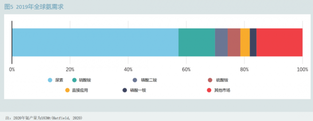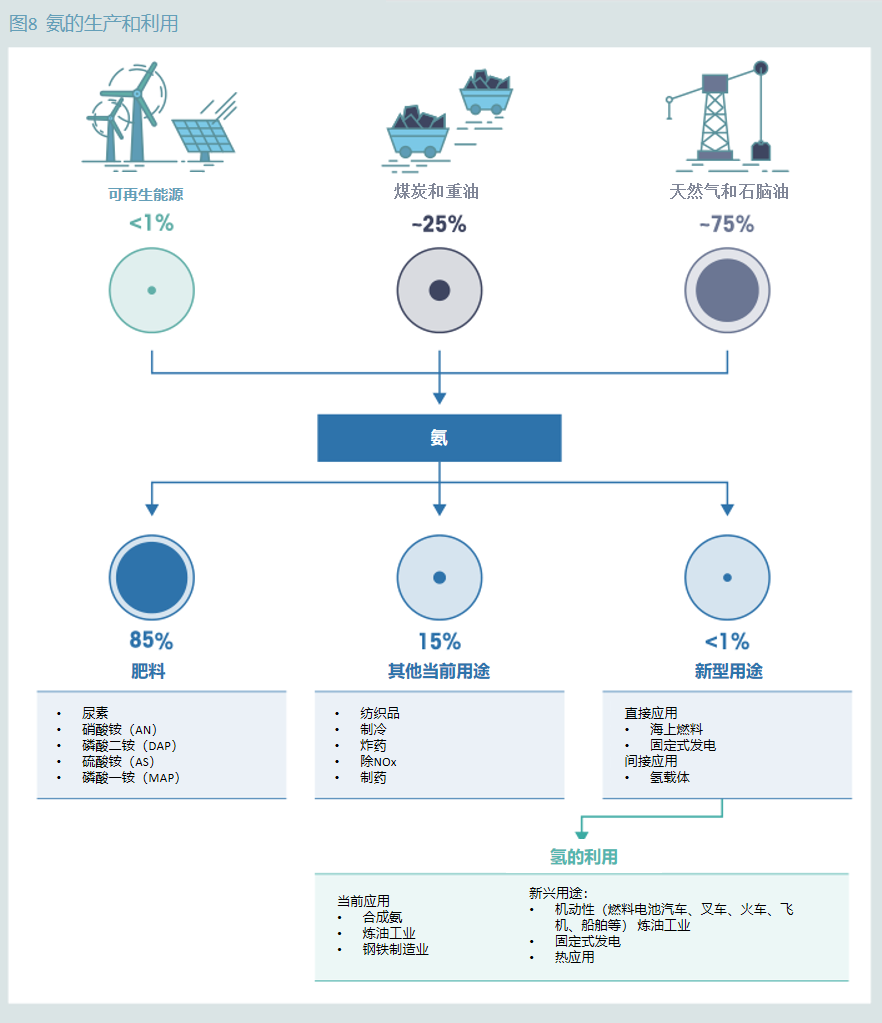 氨是一种重要的全球商品。大约85%的氨用于生产合成氮肥。其在其他领域中也有广泛的应用,如制冷、采矿、制药、水处理、塑料和纤维、减少氮氧化物(NOx)排放等。