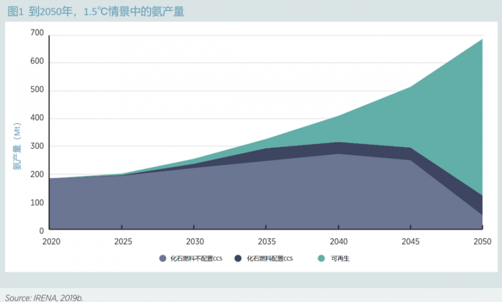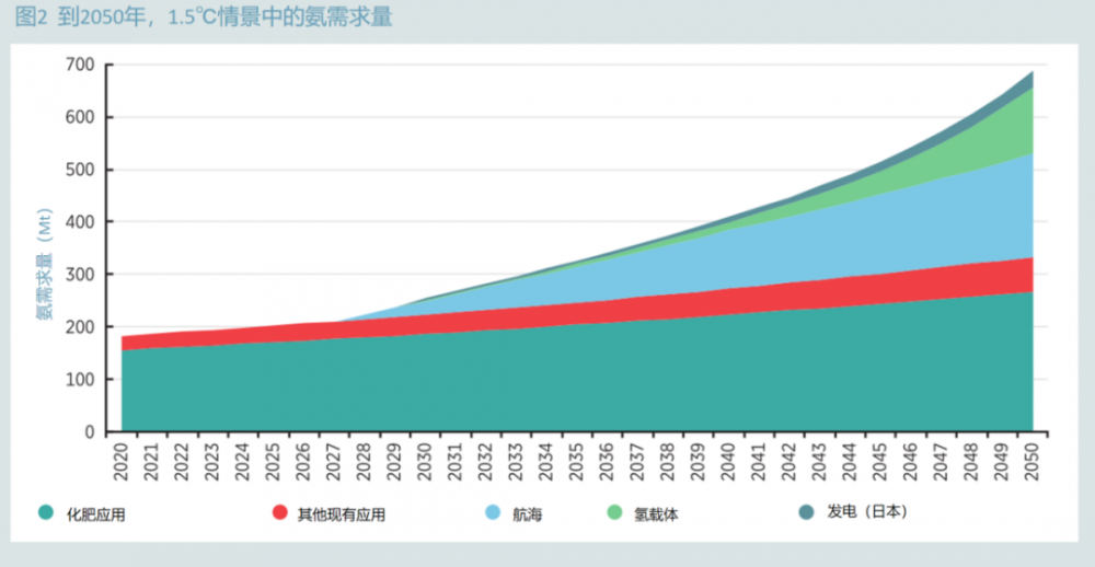 按照《巴黎协定》目标,在满足全球气温上升保持在1.5摄氏度前提下,到2050年全球氨需求量预计将增长3倍,达到6.88亿吨。氨是全球产量排名第二的化工产品,目前大多由天然气(72%)和煤炭(22%)生产,当前产量为1.83亿吨,每年产生的二氧化碳排放量为0.5Gt,约占全球总排放量的1%。随着全球人口的增长、零碳燃料与氢载体等新兴市场的发展,在满足1.5℃目标的前提下,到2050年,全球氨需求量预计将达到6.88亿吨,低碳能源市场规模超过3.54万吨。在全球脱碳与氨需求量增长迅速的背景下,发展可再生氨,助力该行业脱碳成为主要发展目标。