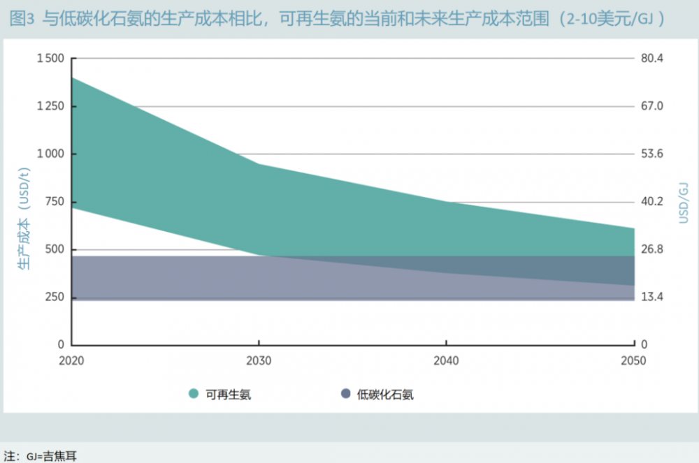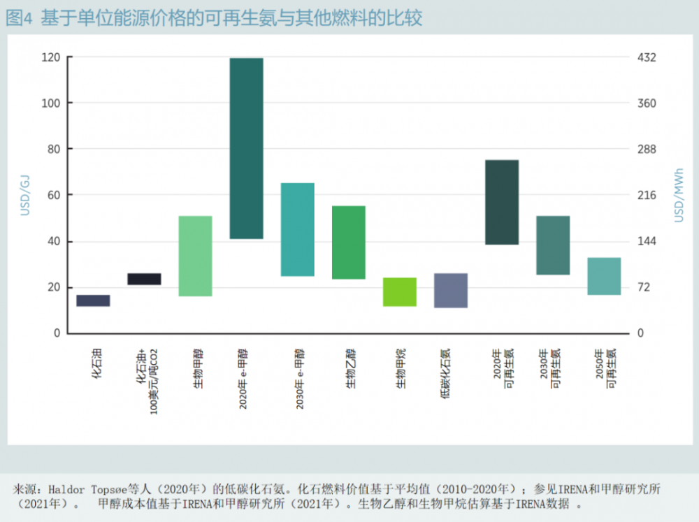 从2030年起,在部分资源优势地区,可再生氨可与配置CCS的化石能源制氢合成氨形成成本竞争力。可再生氨的成本主要取决于可再生氢的成本,占比在90%以上。目前新工厂的可再生氨生产成本为每吨720-1400美元,到2050年降至每吨氨310-610美元。根据IRENA,化石氢和可再生氢的联合生产可以通过利用现有资产和基础设施降低成本,从而引入可再生氨。未来可再生氢生产成本的降低主要取决于可再生能源成本和电解槽成本的降低,以及哈伯-博世氨合成工艺的效率和优化存储、缓冲、尺寸和灵活性的提高。