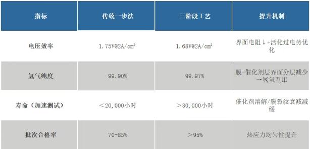 阶梯降温匹配材料收缩率→ 减少膜与催化剂层间的剪切应力,防止分层(电解槽高压差下分层风险>燃料电池)。
