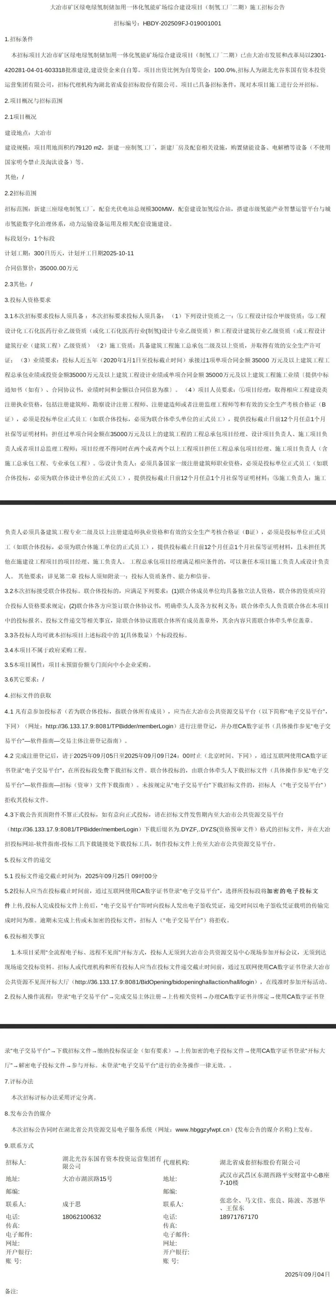 氢能汇获悉,9月4日,大冶市矿区绿电绿氢制储加用一体化氢能矿场综合建设项目(制氢工厂二期)施工招标公告。