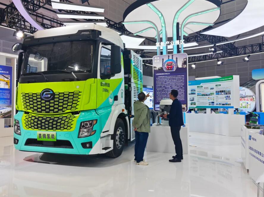 在场外,美锦能源氢燃料电池公交车和氢能重卡构成了一道流动的“绿色风景线”,将展台内的技术成果转化为触手可及的现实图景。以蓝白绿为主色调的12米氢能公交和氢能重卡清新靓丽,车身上的“H?”与“0排放”标识直观彰显其环保属性。截至2025年,美锦能源已推广氢能车辆近4000辆,安全运营里程超2亿公里,减排二氧化碳超22万吨,美锦能源正持续书写着“以氢换油”的降碳答卷。