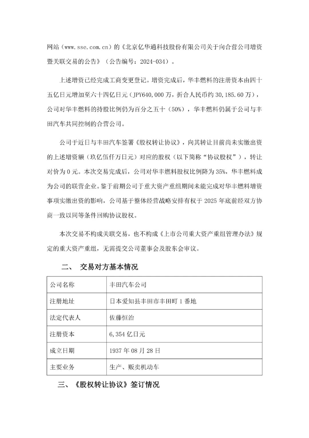 公告称,基于华丰燃料的资金需求,结合公司当前经营情况及战略发展规划,亿华通于近日与丰田汽车公司(简称“丰田汽车”)签署《股权转让协议》,公司将向丰田汽车转让向合营公司华丰燃料认缴且尚未实缴的增资额(玖亿伍仟万日元,折合人民币约4,480.68 万元)对应的股权,转让对价为0元。