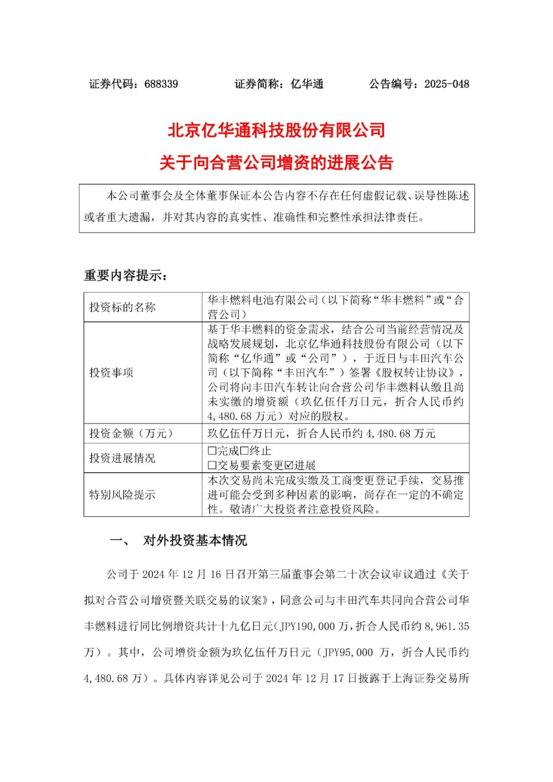 氢能汇获悉,近日,北京亿华通科技股份有限公司 (简称:亿华通)发布关于向合营公司增资的进展公告。