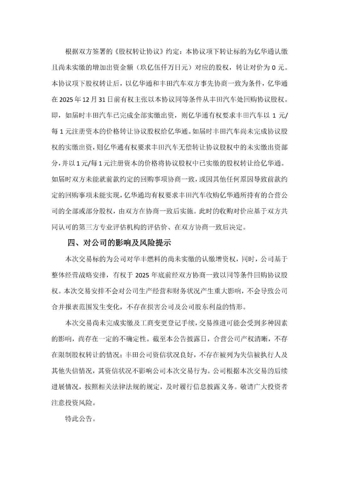 本次交易完成后,亿华通对华丰燃料股权比例降为35%,华丰燃料成为公司的联营企业。鉴于前期公司于重大资产重组期间未能完成对华丰燃料增资事项实缴出资的影响,公司基于整体经营战略安排有权于2025年底前经双方协商一致以同等条件回购协议股权。