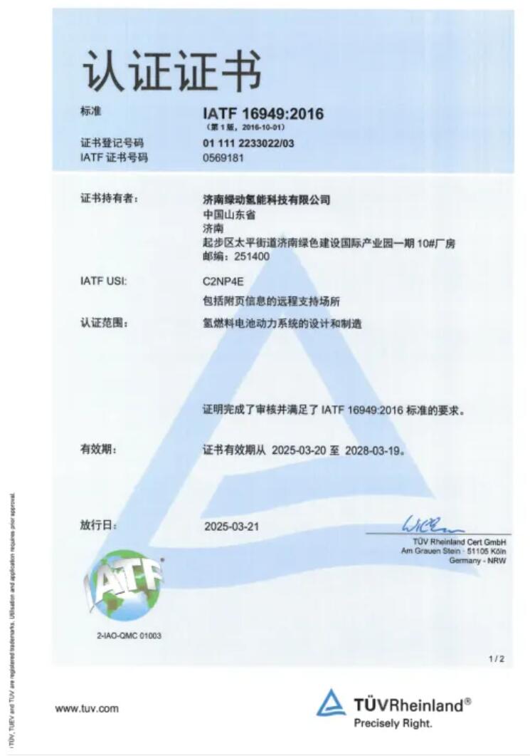 IATF16949是汽车行业质量管理体系的核心国际标准,它不仅仅是普通的质量管理认证,更是汽车供应链企业的“市场准入证”。目前,国氢科技及其子公司宁波绿动、武汉绿动、济南绿动、佛山绿动均已经取得了IATF16949体系认证,认证范围已经涵盖催化剂、质子交换膜、碳纸、气体扩散层、膜电极、燃料电池电堆和动力系统产品。这一认证成果,标志着国氢科技燃料电池全链自主技术产品已全面满足IATF16949质量管理体系的各项要求,对提升公司的质量管理水平、增强企业竞争力、保障产品质量的可靠性以及推动产业的健康发展具有重要意义。