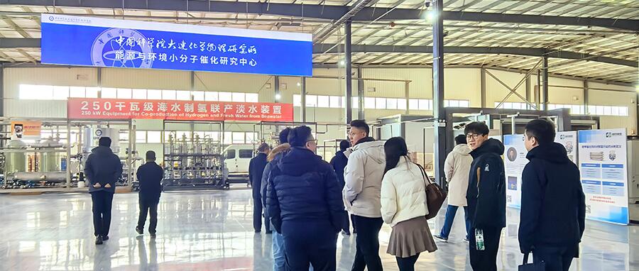 来访人员参观250千瓦海水制氢联产淡水装置和生产基地,了解装置结构、运行流程和应用方向。中国科学院大连化物所朱培鑫对海水制氢联产淡水项目进行介绍,展示关键技术路径及相关数据。