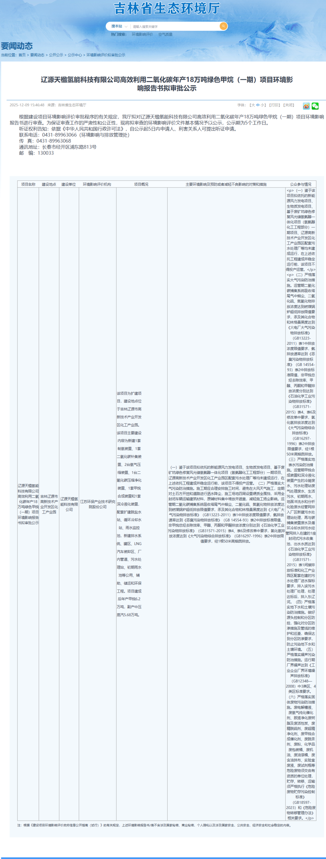 氢能汇获悉,12月9日,吉林省生态环境厅发布《辽源天楹氢能科技有限公司高效利用二氧化碳年产18万吨绿色甲烷(一期)项目环境影响报告书拟审批公示》。