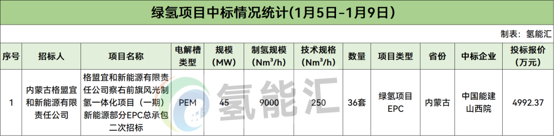 绿氢项目EPC有1个,招标人是内蒙古格盟宜和新能源有限责任公司,中标企业为中国能建山西院。