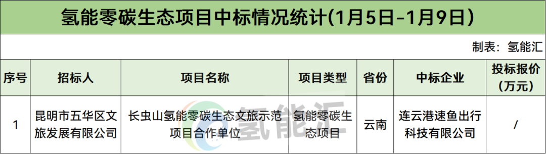 氢能零碳生态项目有1个,招标人是昆明市五华区文旅发展有限公司,中标企业为连云港速鱼出行科技有限公司。