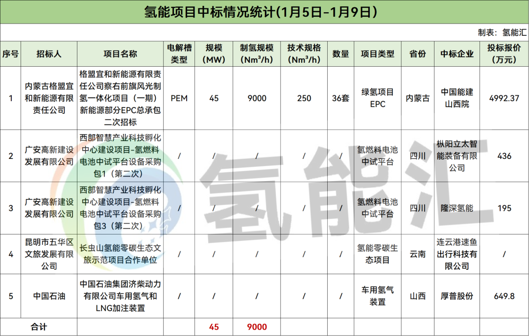 据氢能汇统计,2026年1月5日-2026年1月9日氢能项目招投标方面,累计中标项目有5个,规模总计45MW,制氢规模总9000Nm³/h;招标项目有4个,规模总计100MW,制氢规模总计20000Nm³/h。