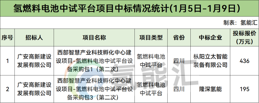 氢燃料电池中试平台项目有2个,招标人是广安高新建设发展有限公司,中标企业分别为枞阳立太智能装备有限公司、隆深氢能。